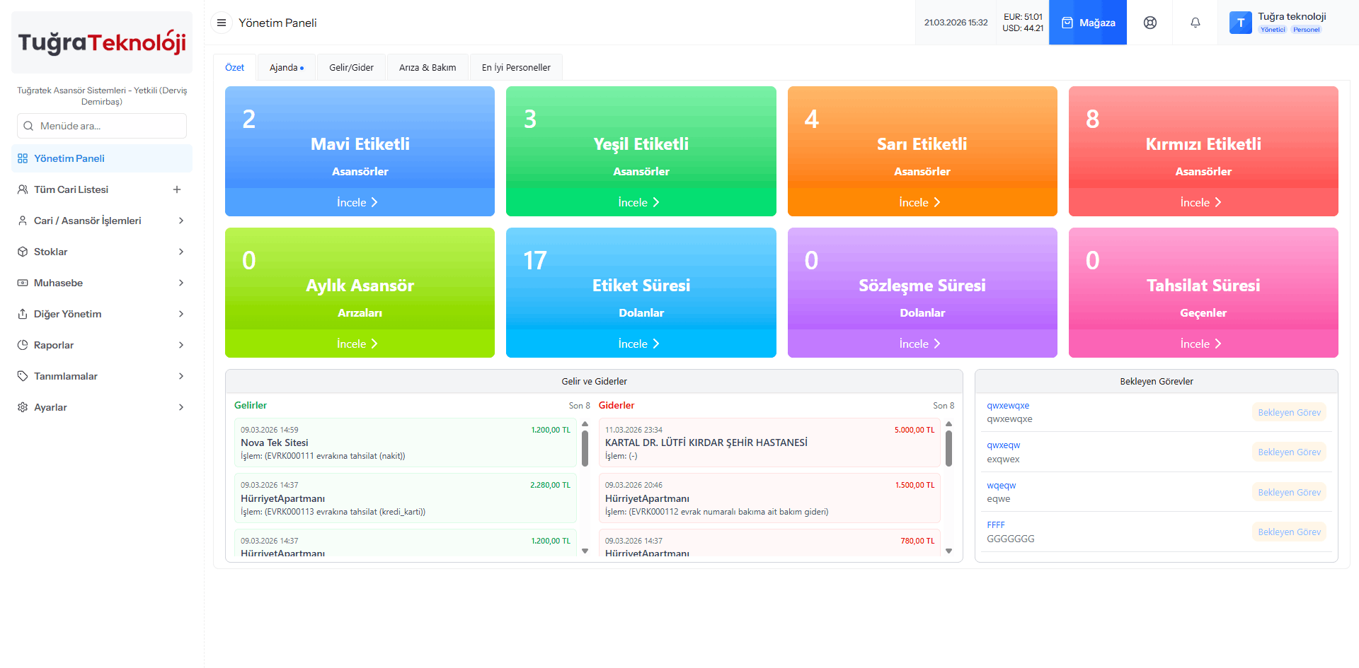 Cari, asansör, arıza, bakım, stok, gelir-gider gibi tüm verileri tek ekrandan yönetin.
